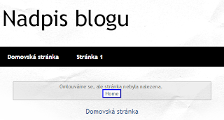 Někdy se vám stane že, když hledáte přesnou stránku (podle URL) tak mnohdy uděláte chybu a tudíž se vám stránka nenajde. Tato situace kdy hledáte stránku která neexistuje se říká chyba 404. Pokud nastane chyba 404 tak se obvykle objeví hláška "Stránka nenalezena". Blogger, ale umí i to že si můžete hlášku přizpůsobit podle libosti. Jedná se sice o detail, ale i tak je dobré s chybou 404 počítat a nabídnout uživateli krom obyčejné hlášky také tlačítko dostat se na hlavní stránku a graficky jí upravit.